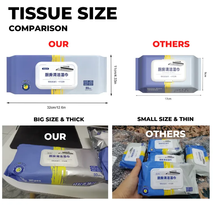 Each pack contains a generous 80 sheets. With its larger size, Big Size tissue is bigger than the market standard (Small Size), offering more surface area for effective cleaning and comfort. These kitchen wipes stay wet longer and are uniquely designed to lock in liquids and clean multiple surfaces, removing messy spills, splatters, grease and stickiness with just one swipe the remains.